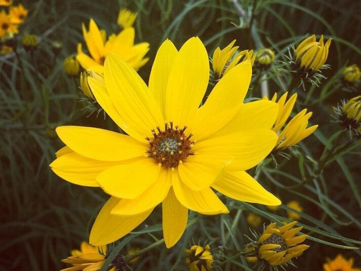 Architectonische, hoge plant uit Noord-Amerika met lange, fraai wilgachtig bebladerde stengels en in de herfst kleine zonnebloemetjes als toegift. Houdt van een zonnige plek in normale, liefst niet te zure grond.