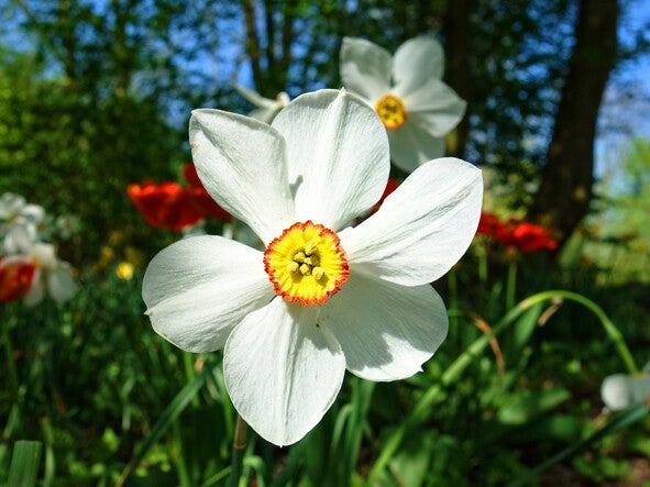 De laatbloeiende dichtersnarcis komt oorspronkelijk uit de Alpenweiden en heeft heerlijk geurende bloemen. Trekt hommels en bijen. Voedzame vochtige humeuze grond. Geschikt voor verwildering. Bekroond met een Award of Garden Merit, de hoogste onderscheiding die een tuinplant kan krijgen.