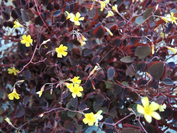 Deze Oxalis is een geheel andere soort en woekert dus zeker niet. Hij kan in de tuin (overleeft dan een vorstje meestal niet) maar kan dus ook erg mooi in een pot. Laat 'm dan binnenshuis overwinteren in een niet verwarmde ruimte.