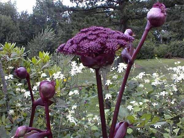 Forse tweejarige tot kortlevende opvallende verschijning met donkere stelen, dik opzwellende knoppen en purperen bolle bloemschermen. Voedzame vochthoudende grond. Na de bloei opnieuw zaaien.